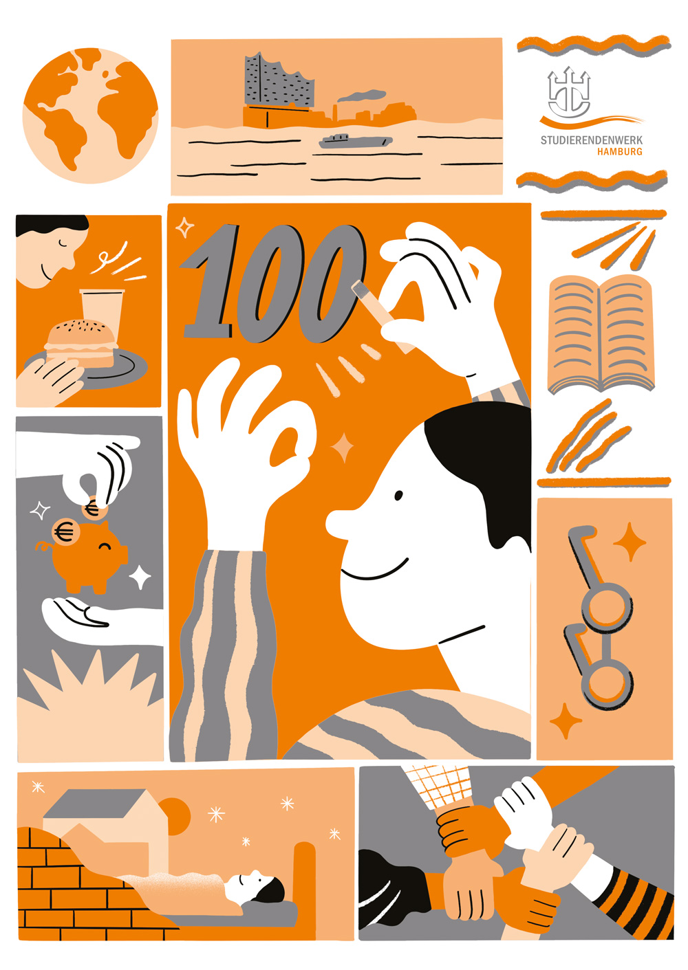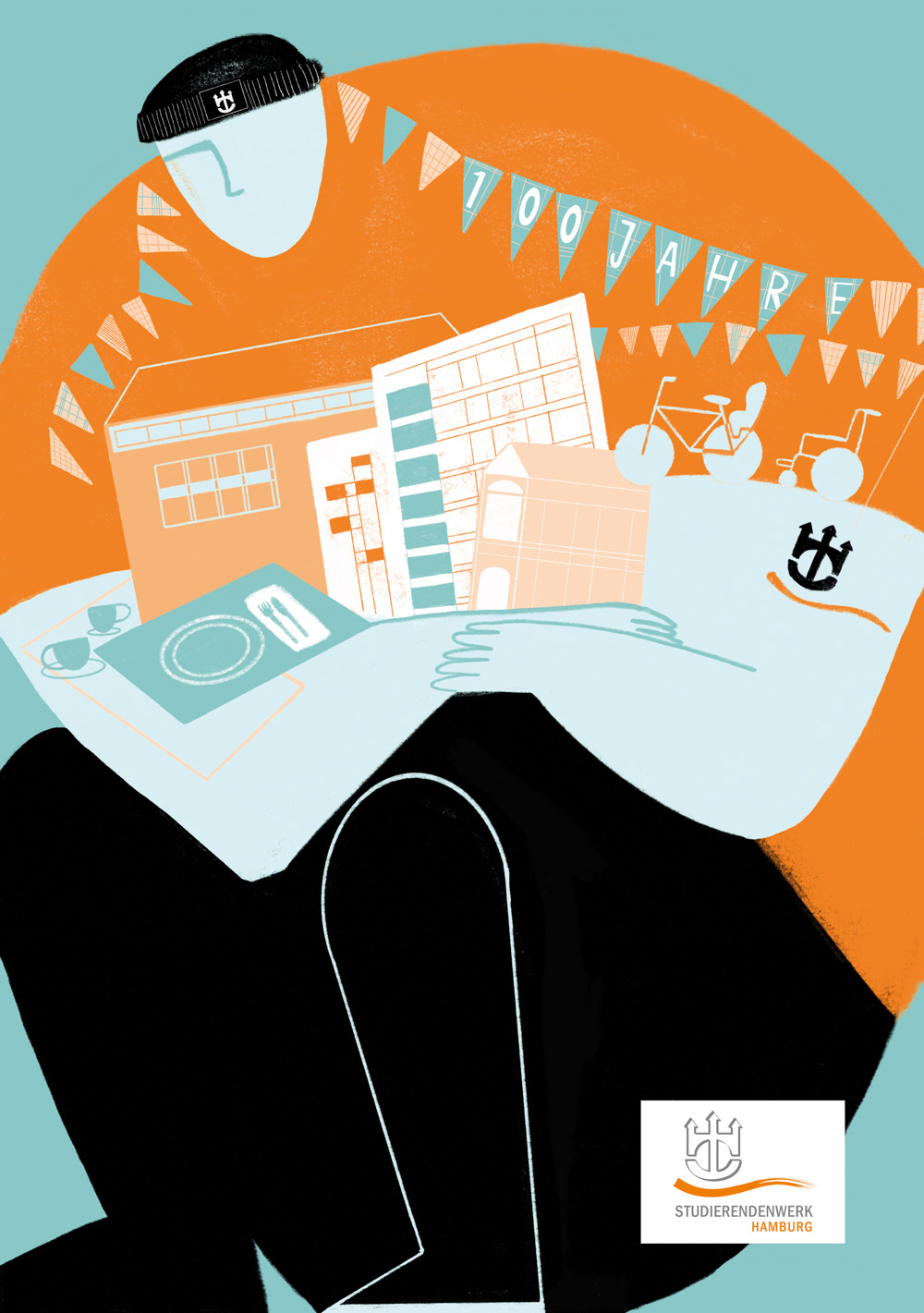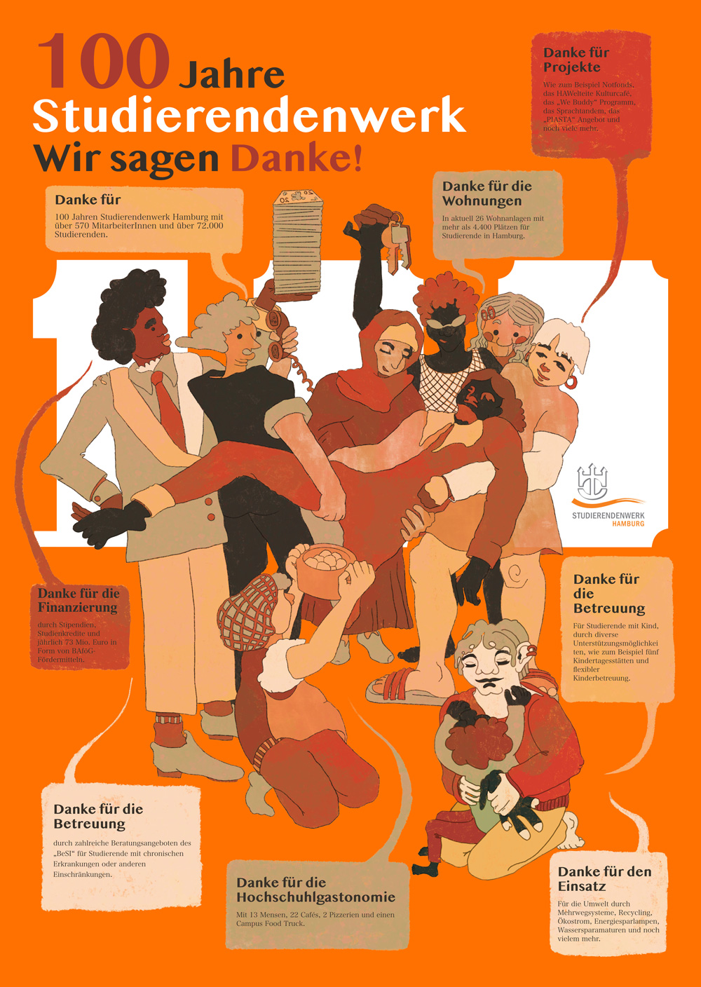 Anlässlich unseres 100-jährigen Jubiläums wollten wir wissen, was Hamburger Studierende bewegt und haben Illustrations- und Kommunikationsdesignstudierende der Hochschule für Angewandte Wissenschaften Hamburg (HAW) und der Hochschule für bildende Künste (HFBK) aufgerufen, Plakate mit ihren Ideen und Denkanstößen einzureichen.